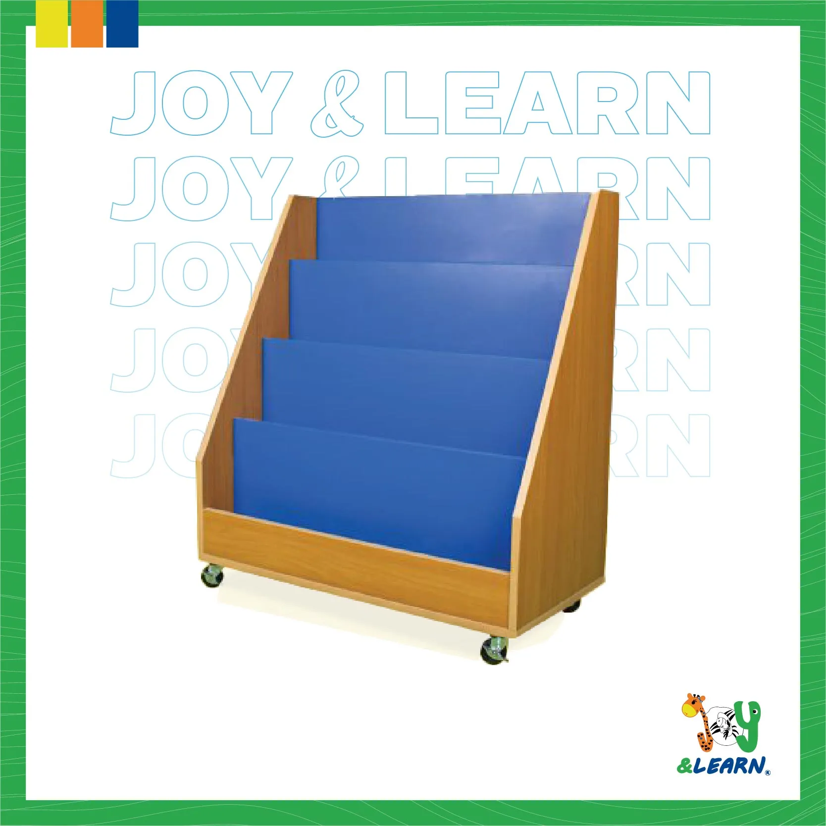 A library that is indispensable in schools, nurseries, and preschools. It is equipped with wheels for easy movement from one place to another. It has brakes to increase its stability and safety for children.